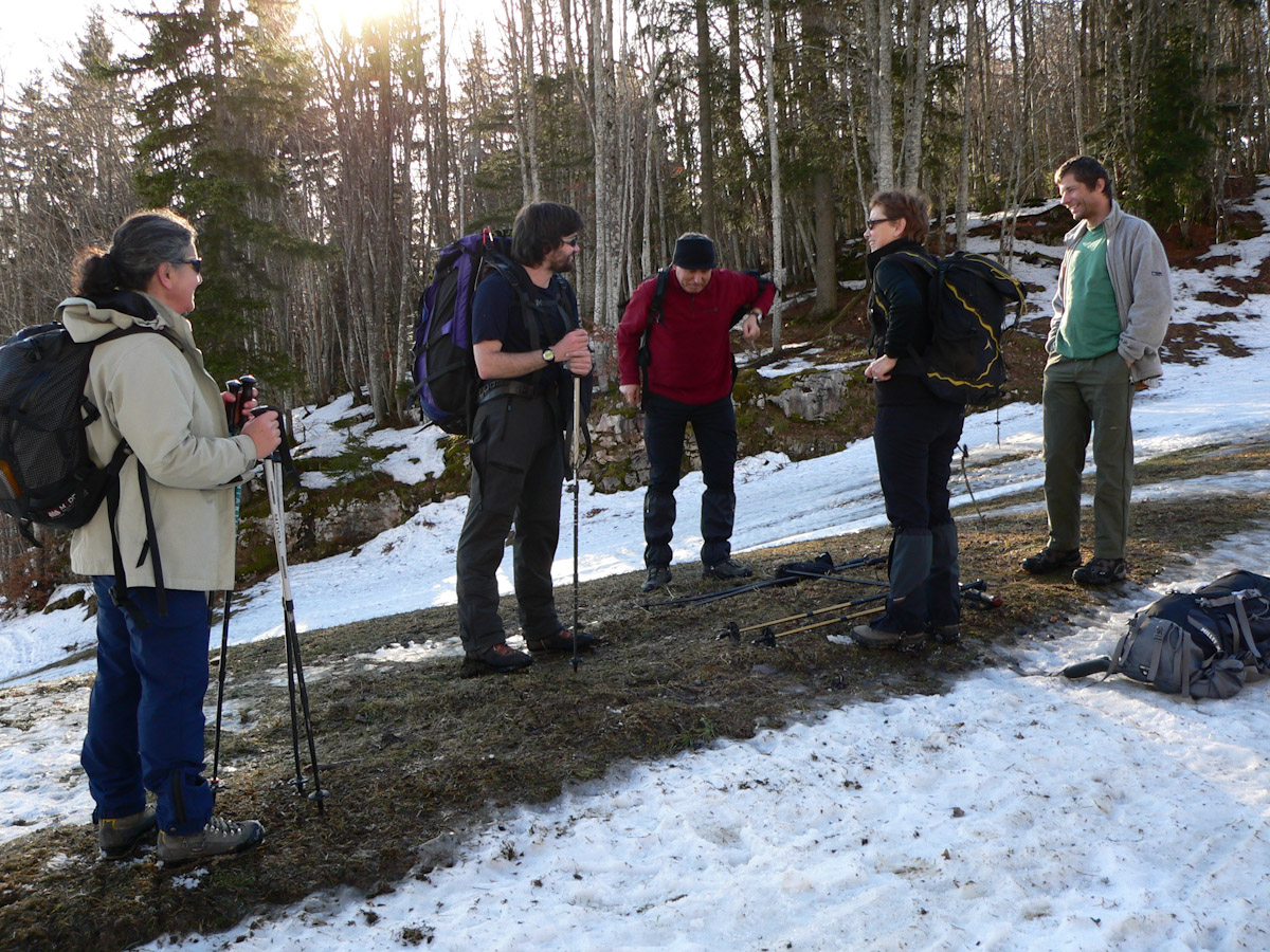 Matériel : bâtons, raquettes (il reste encore de la neige suivant les versants, il faudra peut être les porter par moment ou bien les laisser aux voitures avec le risque de patauger !!!), guêtres, vêtements imperméables, et coupe-vent + ...