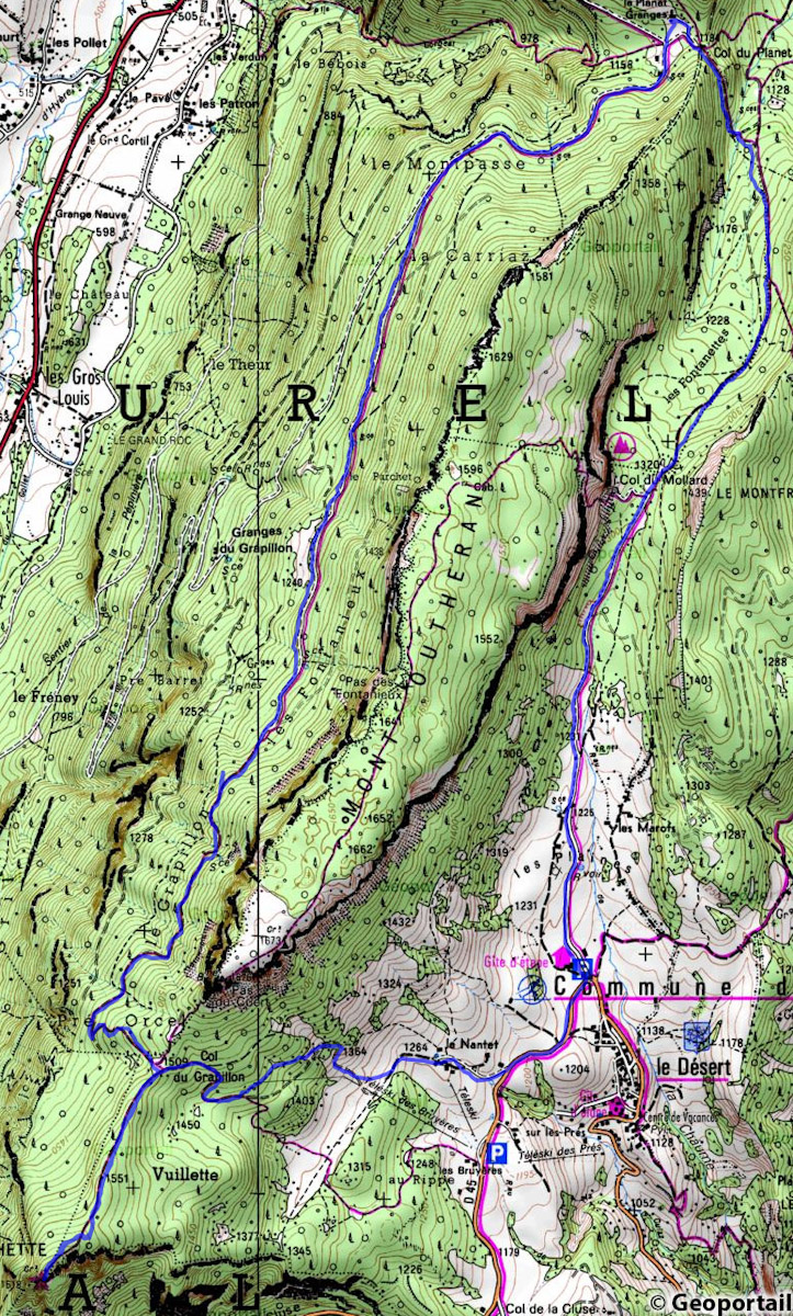 Itinéraire routier : Col de la Placette, St Laurent du Pont, Les Echelles (et direction Chambéry à droite), Col de Couz prendre à droite pour Corbel, le Désert d'Entremont.