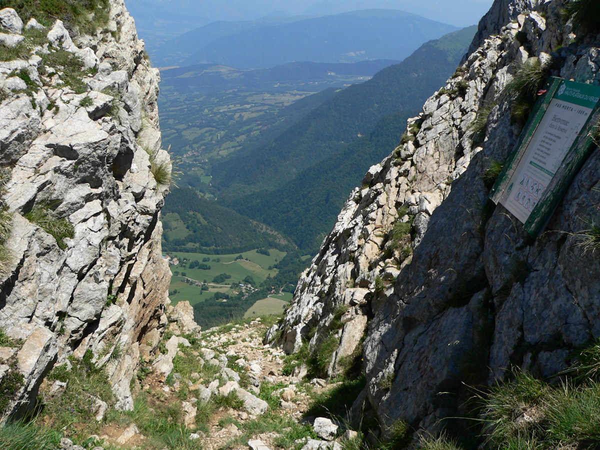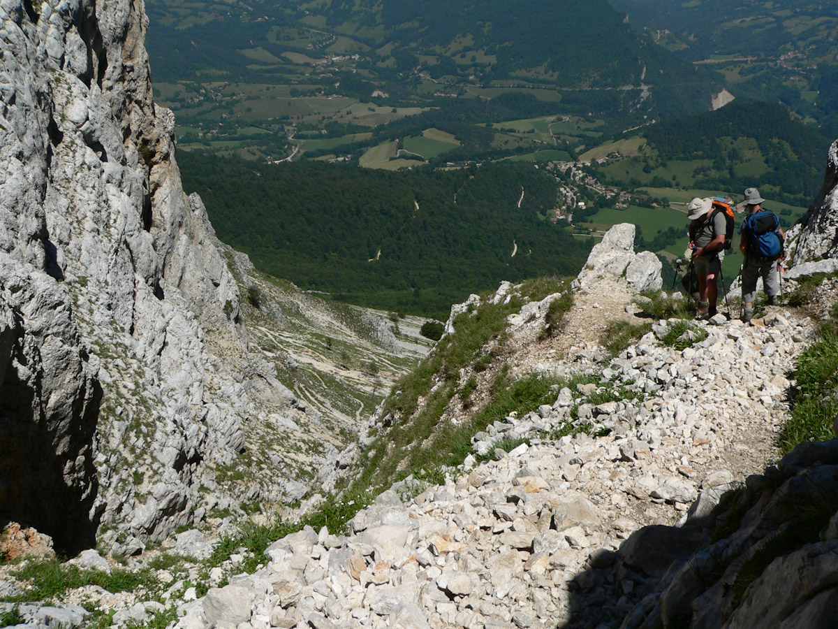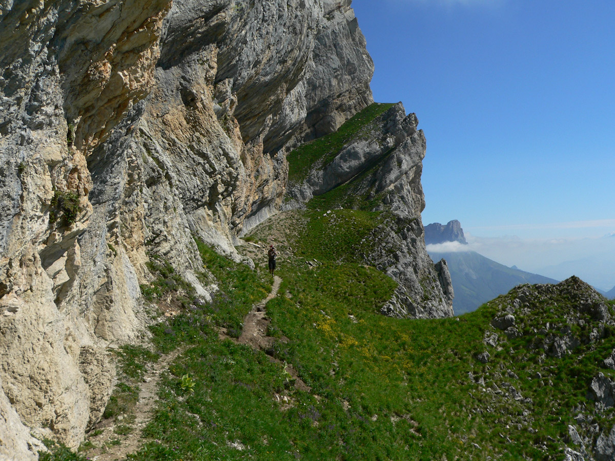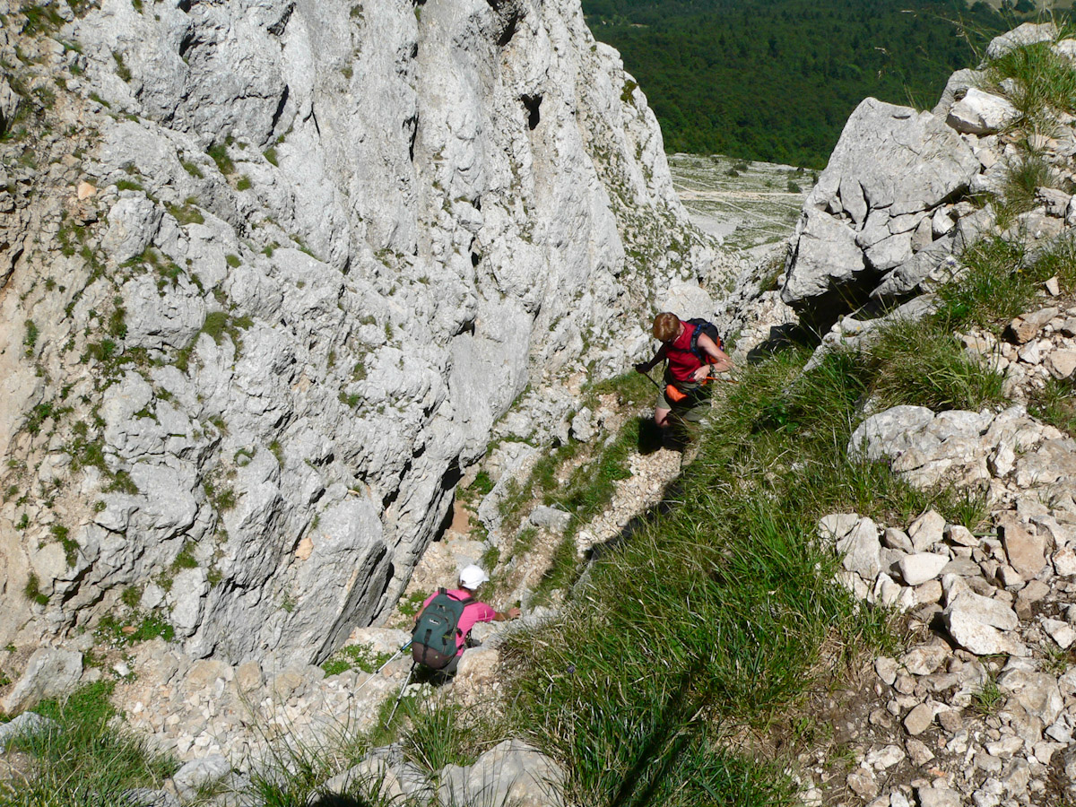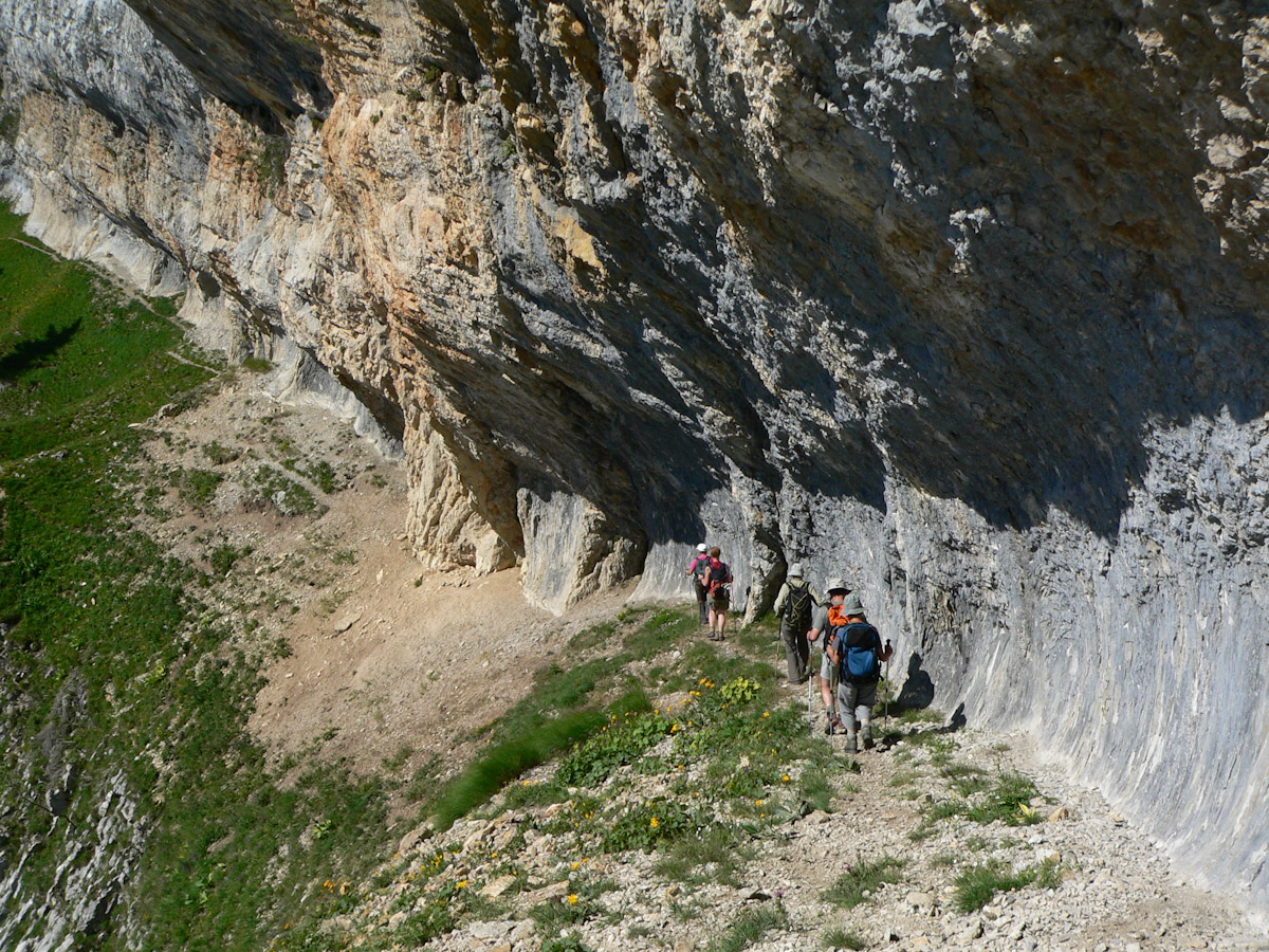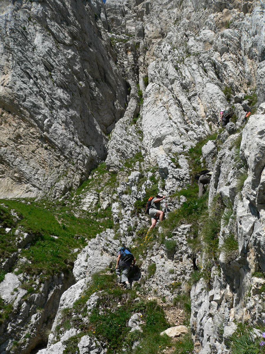 Difficulté : Un ensemble de passages exposés qui réclament prudence et beaucoup d'attention : passage aérien sur des pentes abruptes, vire herbeuse en pleine falaise mais bien tracée (style celle des Deux Soeurs que l'on a déjà faite, mais en plus beau), un couloir rocheux pour le pas de Serre Brion et pierreux pour le Pas Morta. Les chemins sont souvent caillouteux et parfois dégradés. Pas de sentier sur la crête, parcours entre herbes et lapiaz (nous en avons déjà fait une partie lors de notre passage aux Rochers de La Peyrouse (avec Janine en 2008).