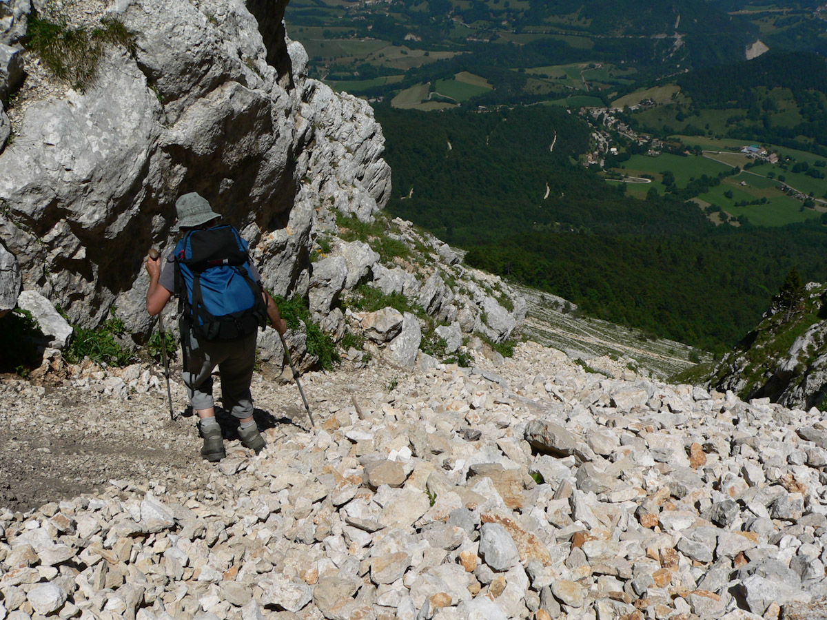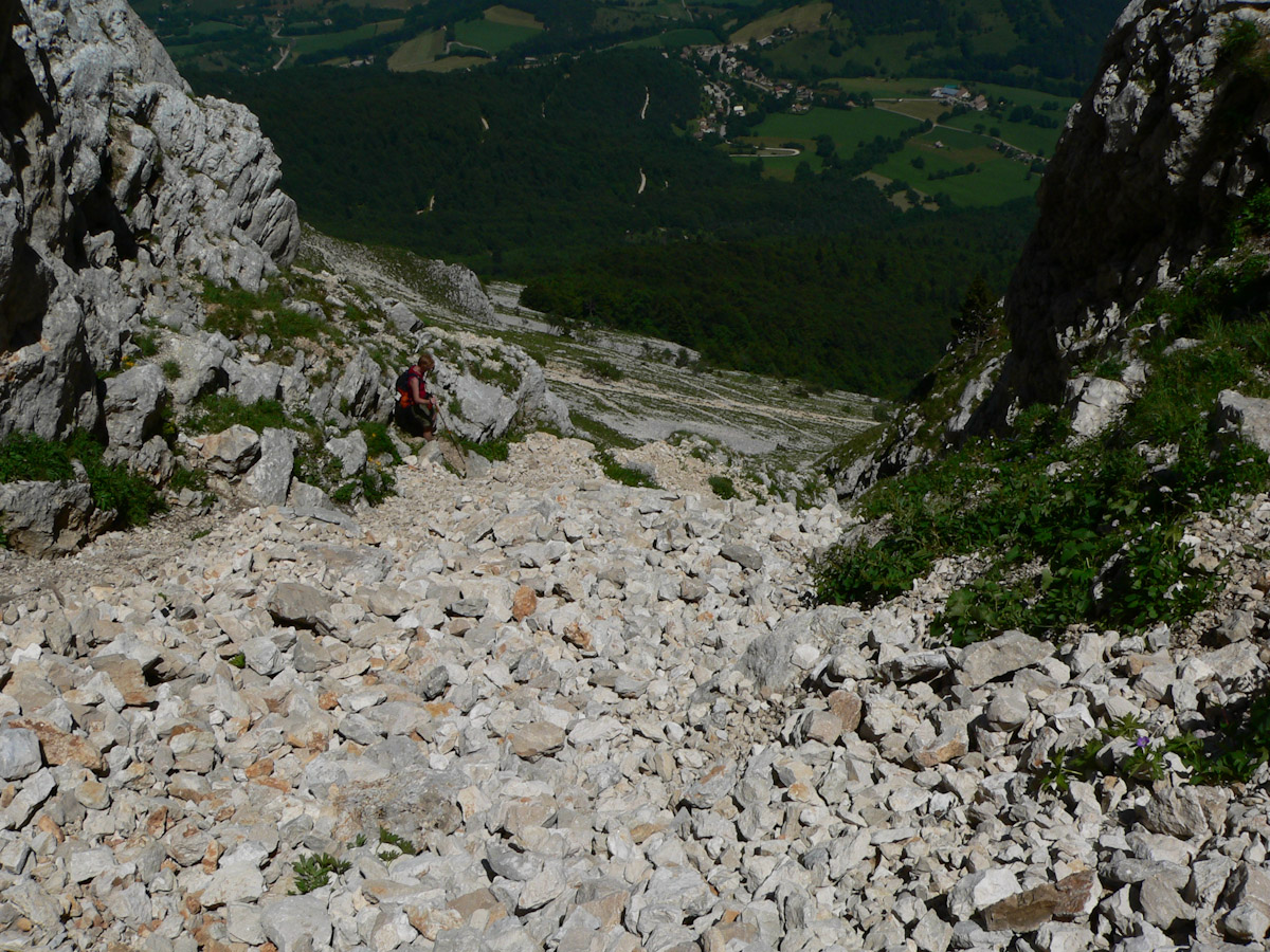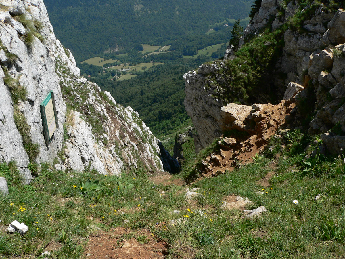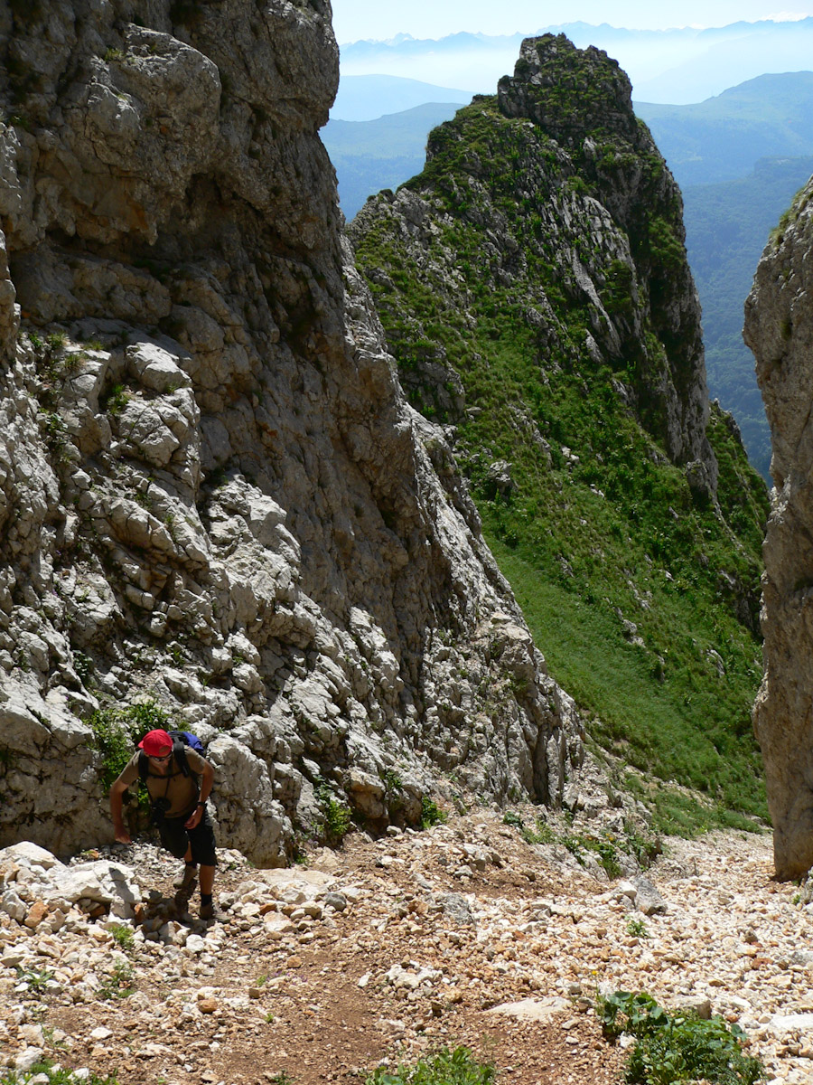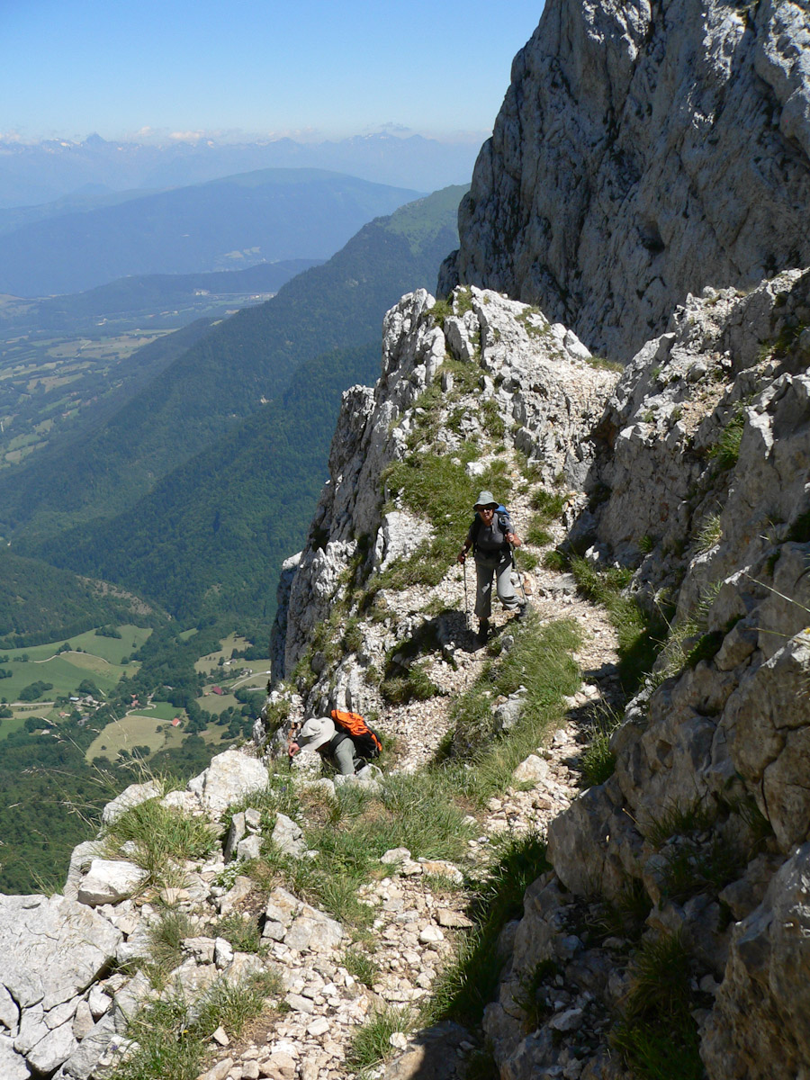Difficulté : Un ensemble de passages exposés qui réclament prudence et beaucoup d'attention : passage aérien sur des pentes abruptes, vire herbeuse en pleine falaise mais bien tracée (style celle des Deux Soeurs que l'on a déjà faite, mais en plus beau), un couloir rocheux pour le pas de Serre Brion et pierreux pour le Pas Morta. Les chemins sont souvent caillouteux et parfois dégradés. Pas de sentier sur la crête, parcours entre herbes et lapiaz (nous en avons déjà fait une partie lors de notre passage aux Rochers de La Peyrouse (avec Janine en 2008).