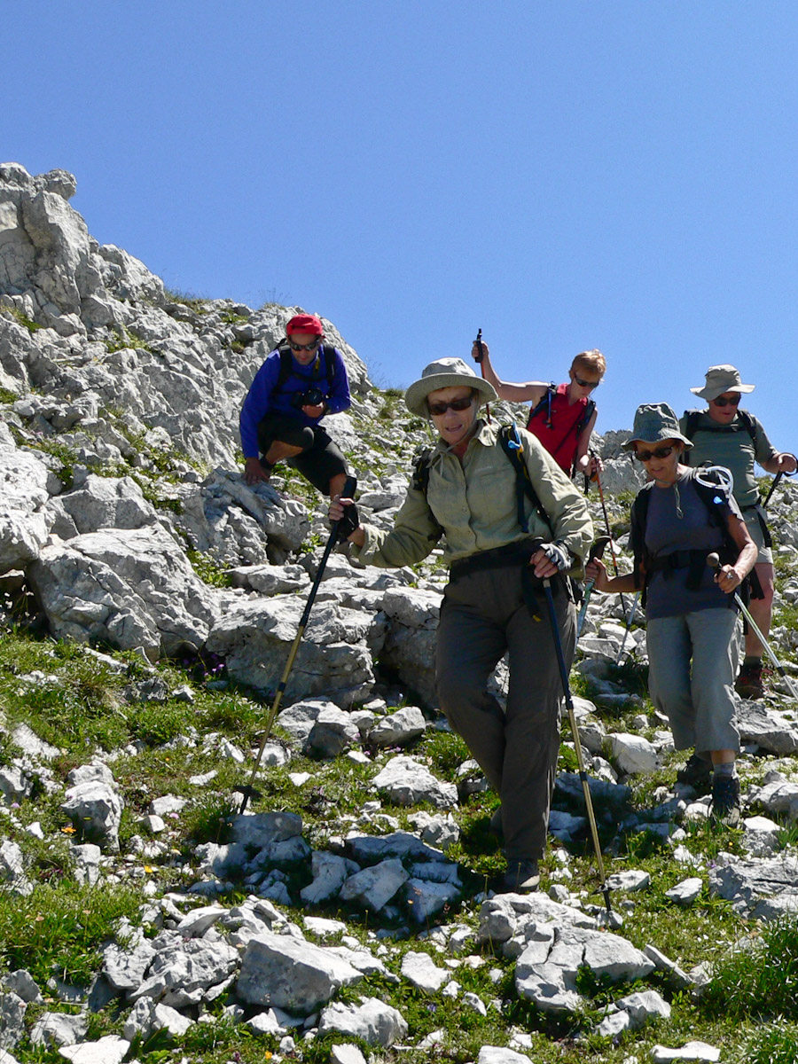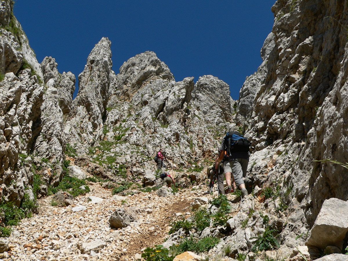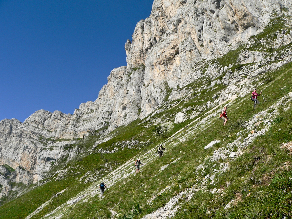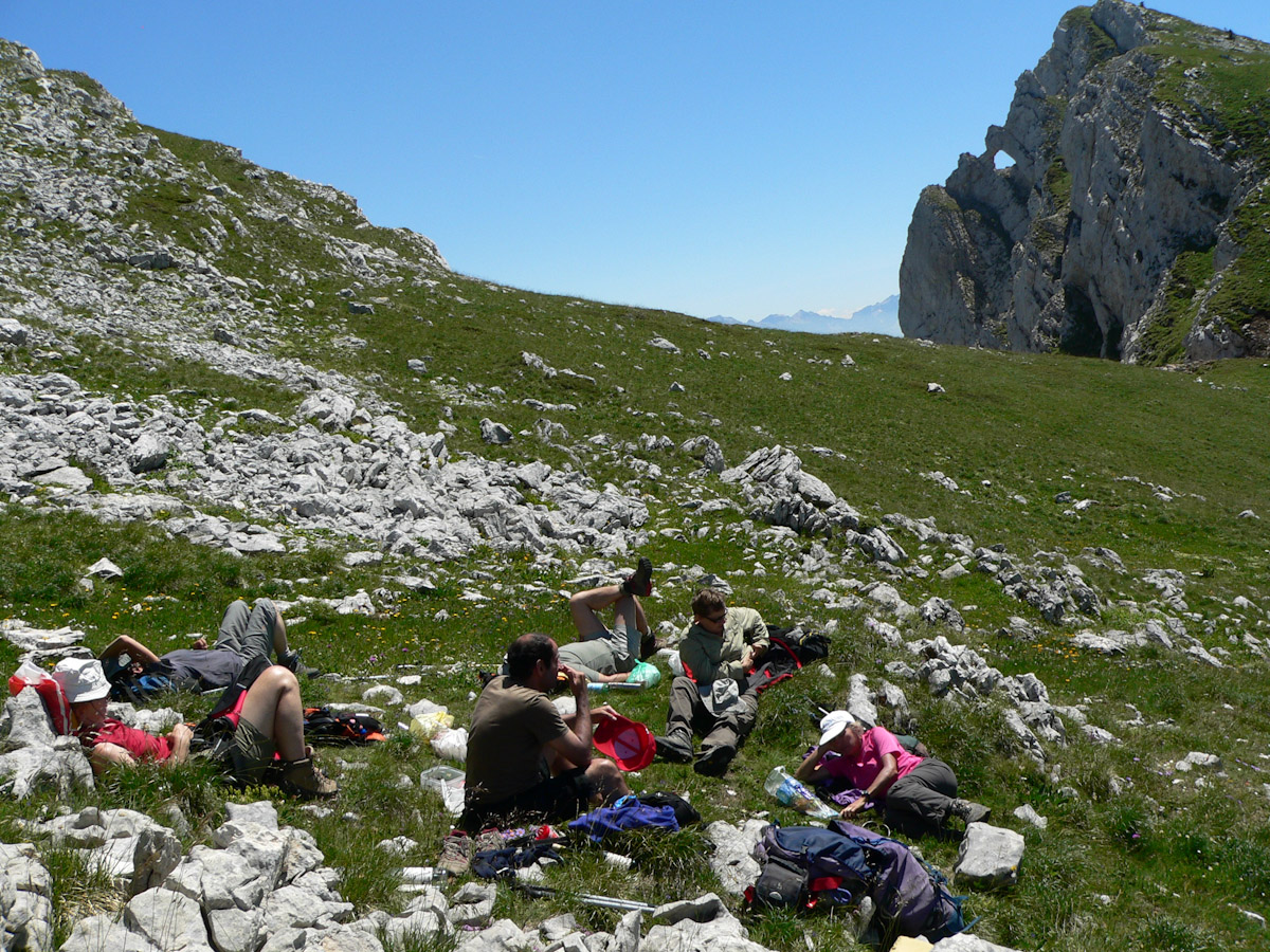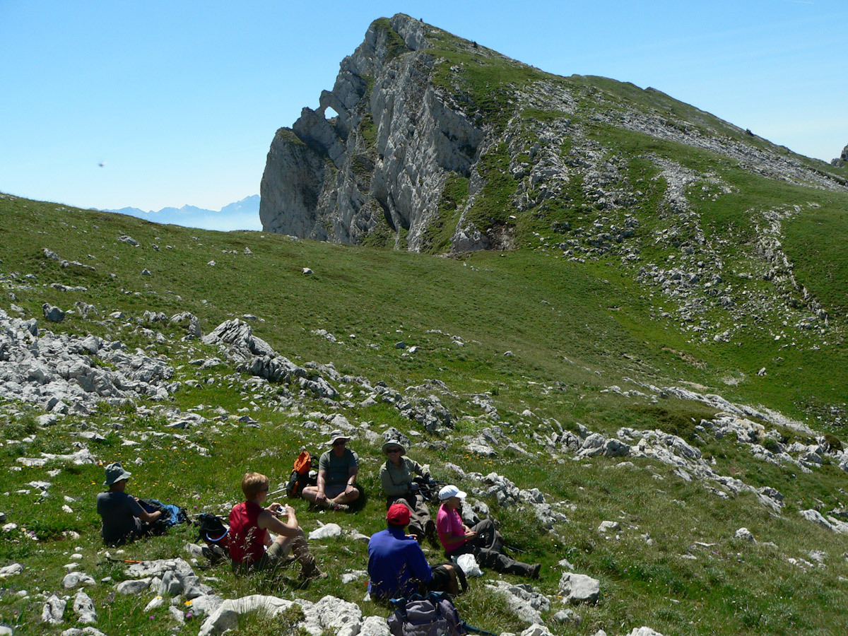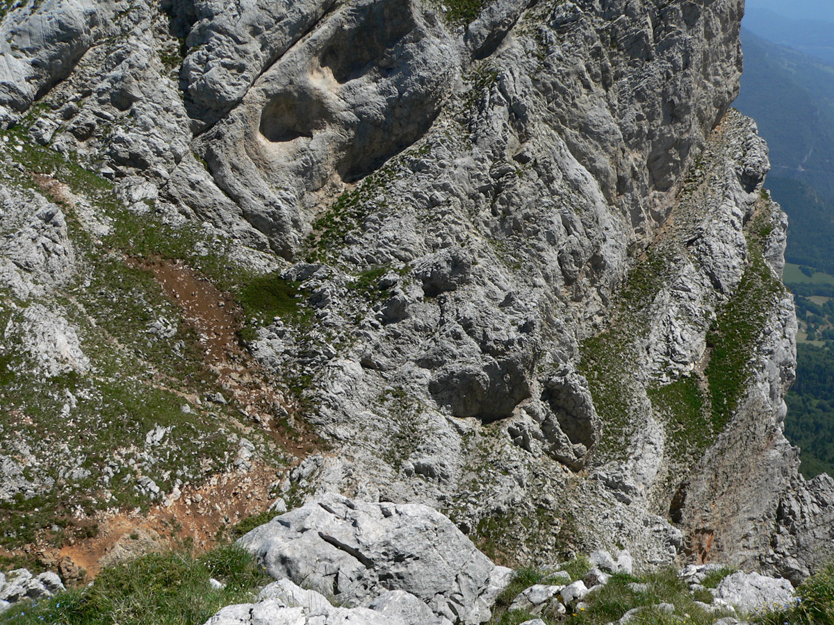 Difficulté : Un ensemble de passages exposés qui réclament prudence et beaucoup d'attention : passage aérien sur des pentes abruptes, vire herbeuse en pleine falaise mais bien tracée (style celle des Deux Soeurs que l'on a déjà faite, mais en plus beau), un couloir rocheux pour le pas de Serre Brion et pierreux pour le Pas Morta. Les chemins sont souvent caillouteux et parfois dégradés. Pas de sentier sur la crête, parcours entre herbes et lapiaz (nous en avons déjà fait une partie lors de notre passage aux Rochers de La Peyrouse (avec Janine en 2008).