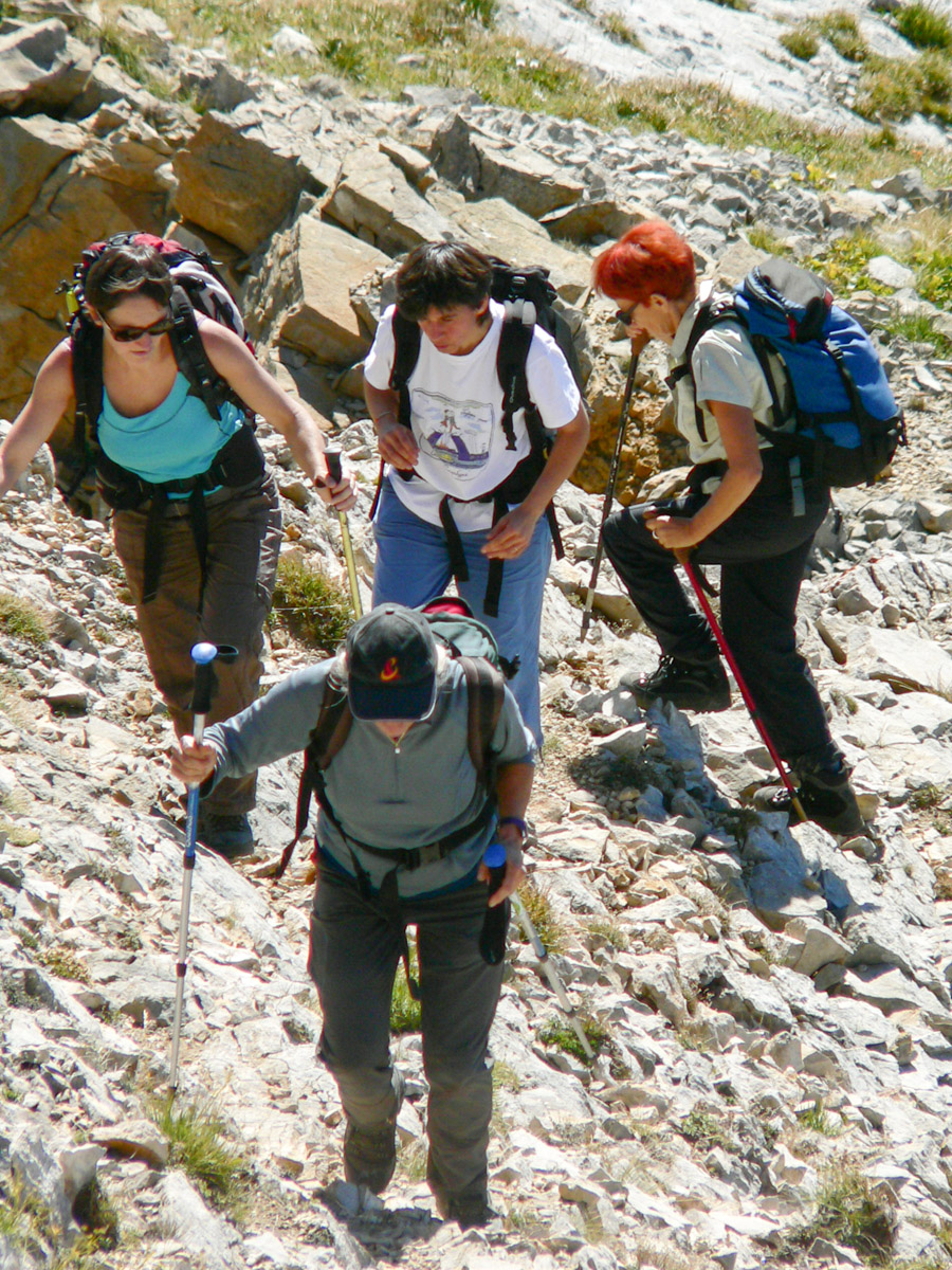 Matériel : bâtons télescopiques, polaire, coupe vent, couvre chef, crème solaire + ... eh bien tout le reste.
