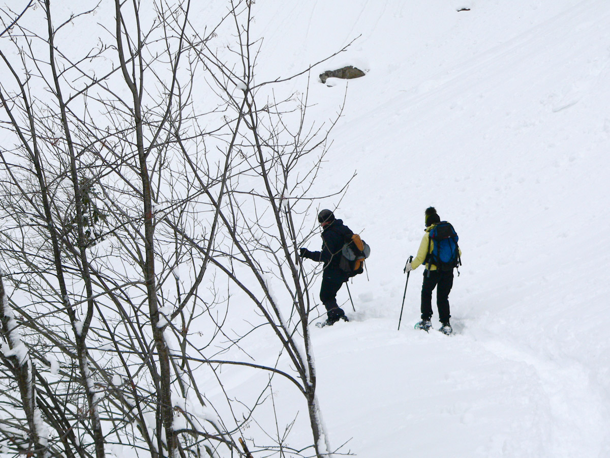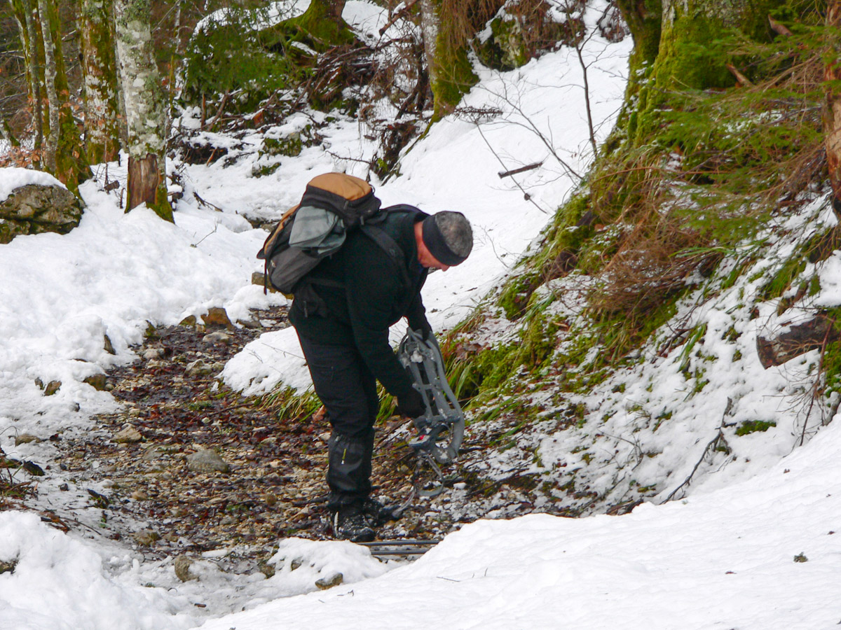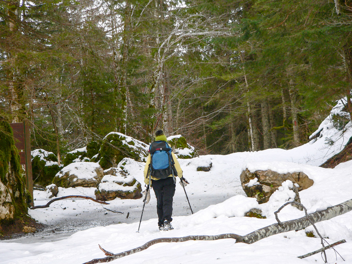 Matériel : Vêtements coupe vent et imperméables, bâtons, polaire, bonnet, gants, guêtres, raquettes et autres chaînes à neige, frontale et gobelet au fond du sac, kit arva-pelle-sonde, + ... eh bien tout le reste.