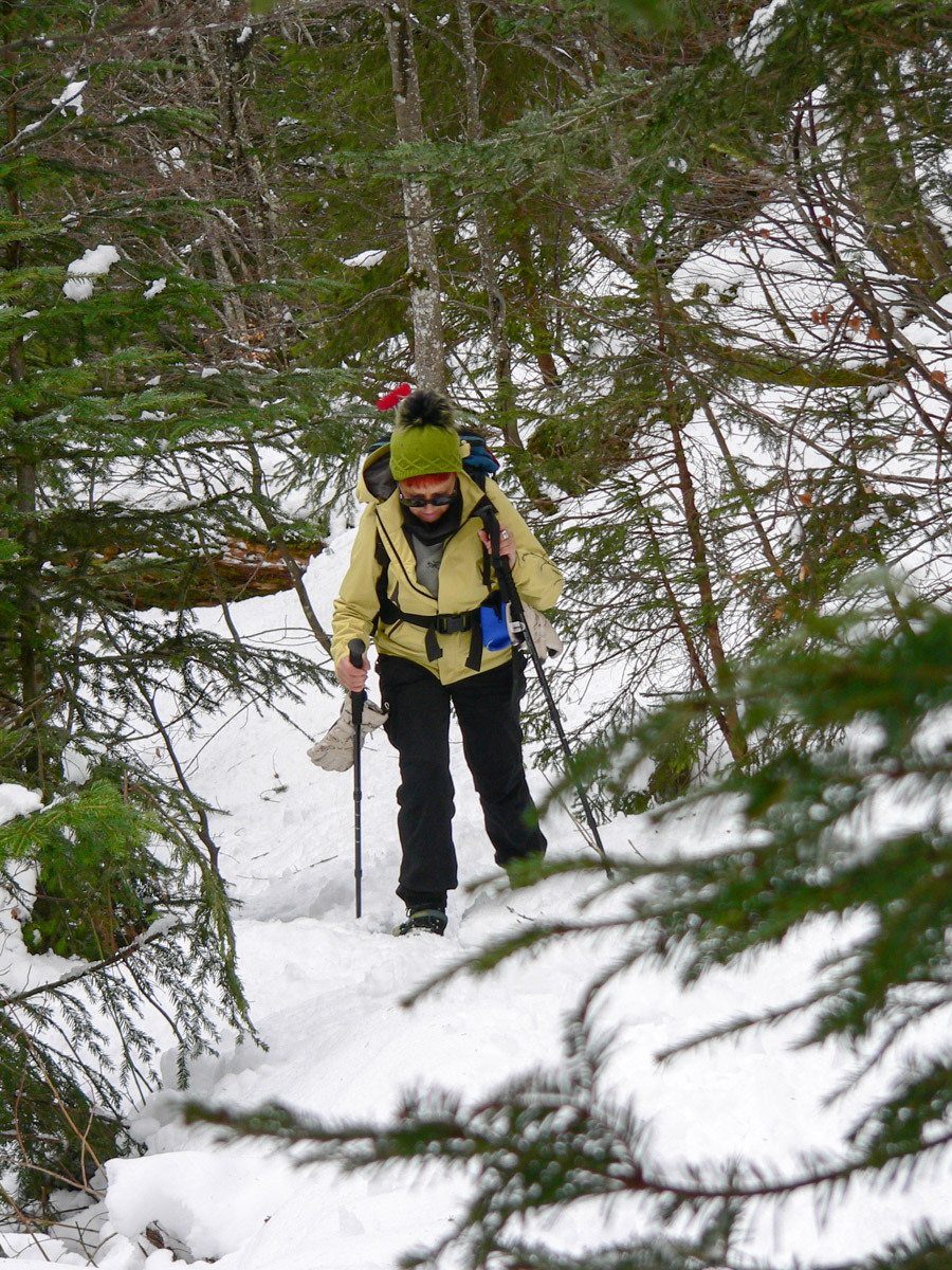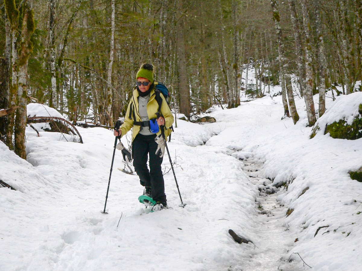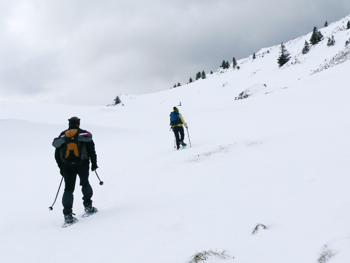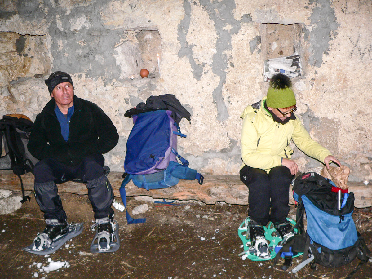 Matériel : Vêtements coupe vent et imperméables, bâtons, polaire, bonnet, gants, guêtres, raquettes et autres chaînes à neige, frontale et gobelet au fond du sac, kit arva-pelle-sonde, + ... eh bien tout le reste.