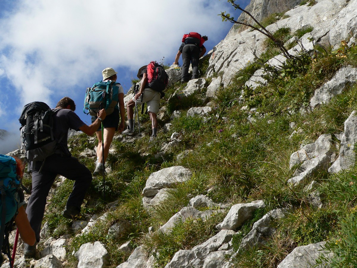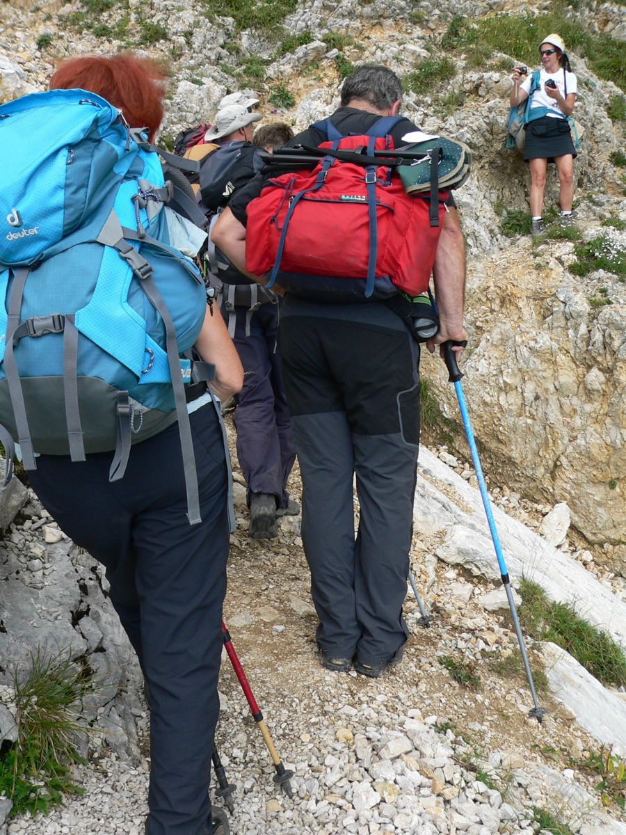 Matériel : Vêtements de saison, bâtons, couvre chef, crème solaire, gobelet au fond du sac, + ... eh bien tout le reste.