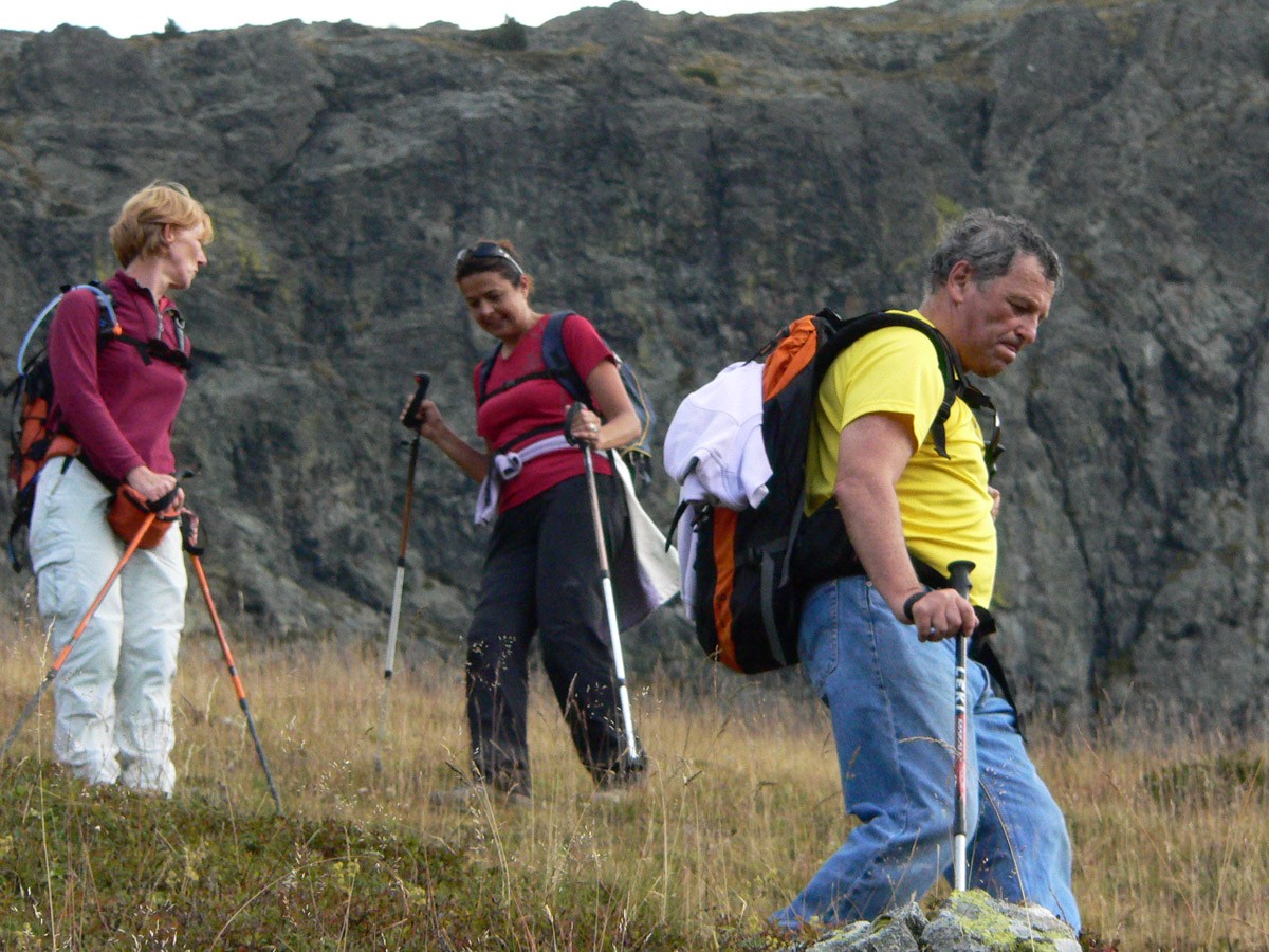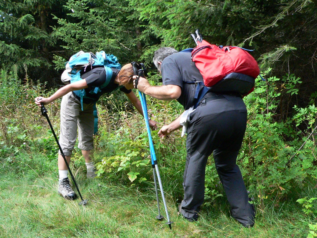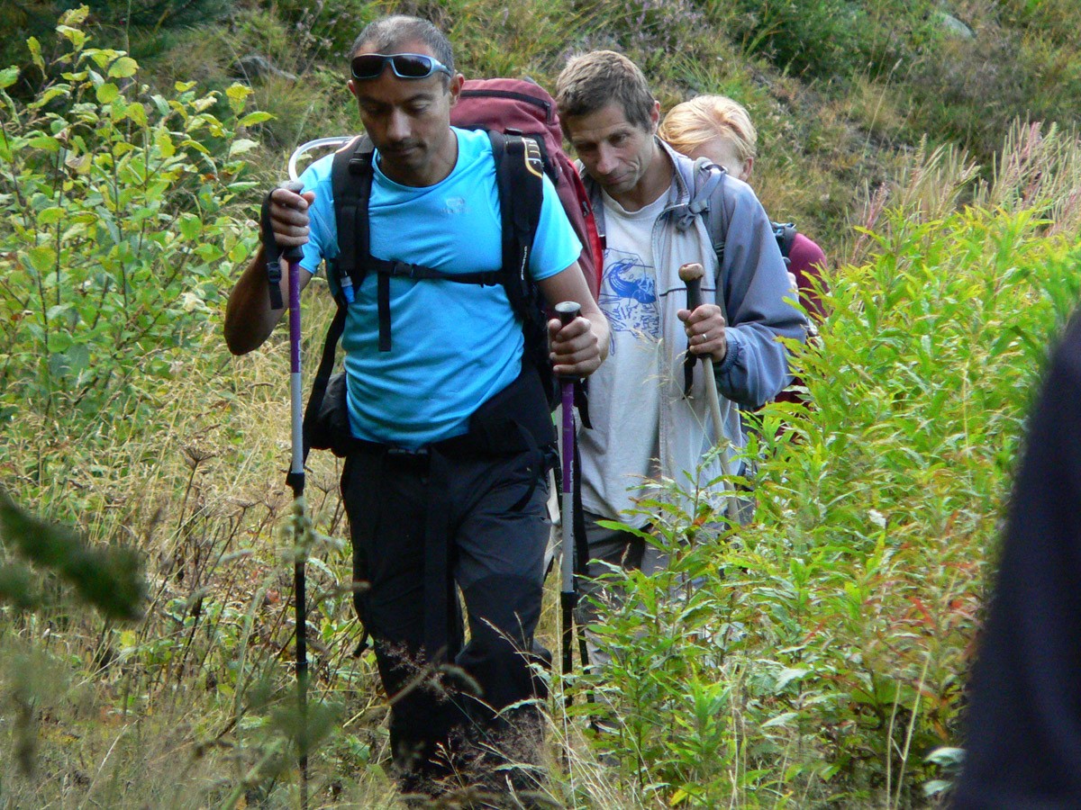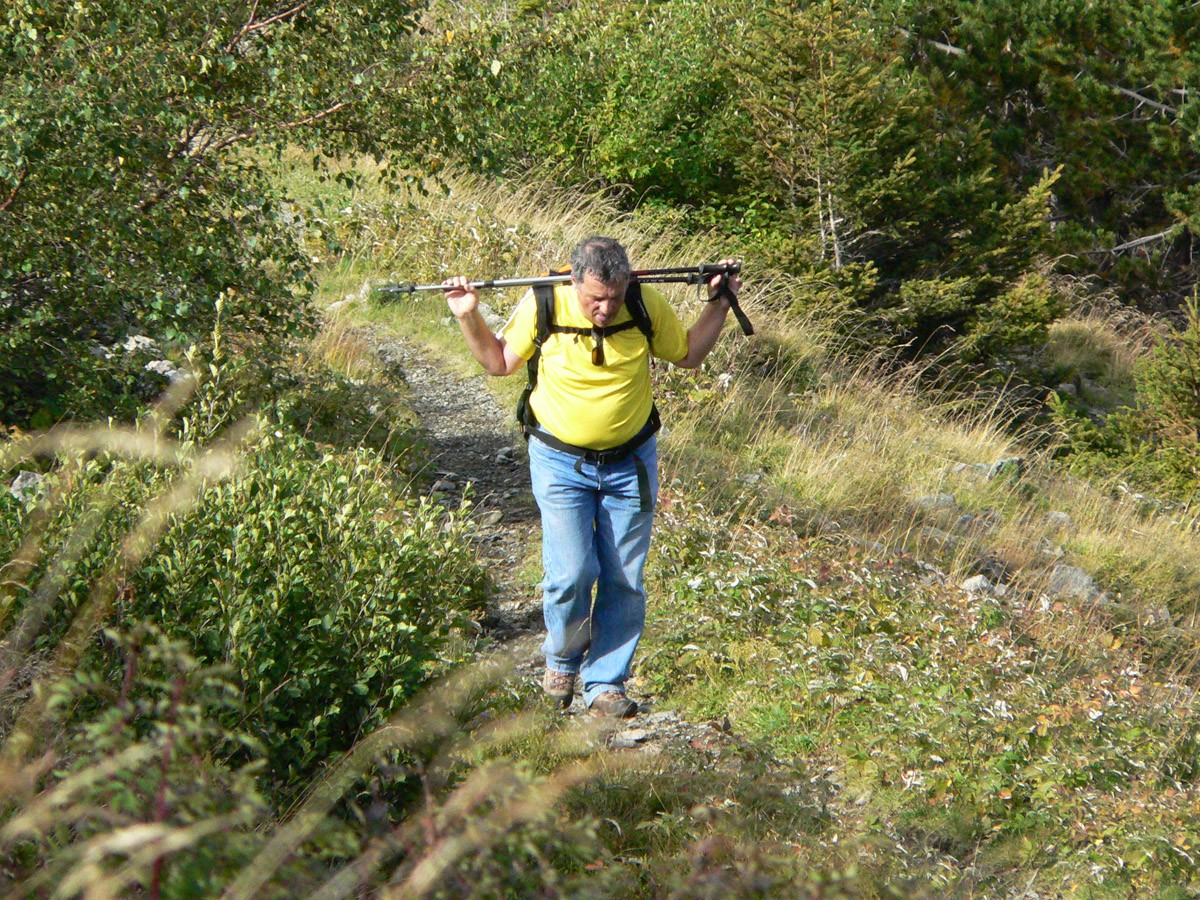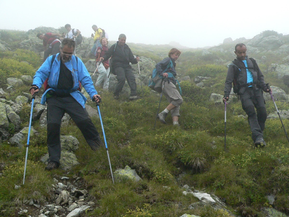 Matériel : Vêtements de saison et imperméable en cas de pluie (!), bâtons, couvre chef (avec paratonnerre), crème solaire (on l'espère utile), gobelet au fond du sac, + ... eh bien tout le reste.