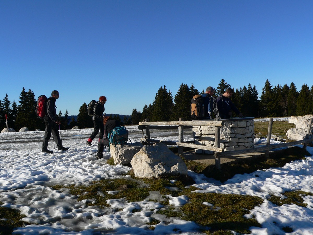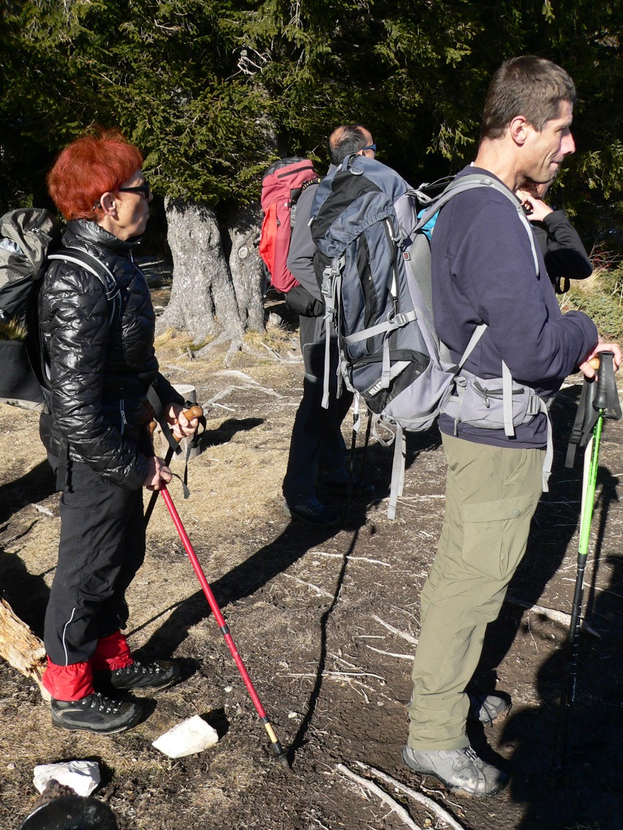Matériel : Vêtements imperméables, coupe vent et chauds, guêtres, bâtons, polaire, bonnet, gants, frontale (vérifier les piles), chaînes à neige qui peuvent remplacer les raquettes (celles-ci ne sont pas nécessaires sauf pour les parties gelées où on peut se servir des crampons) + ... eh bien tout le reste.