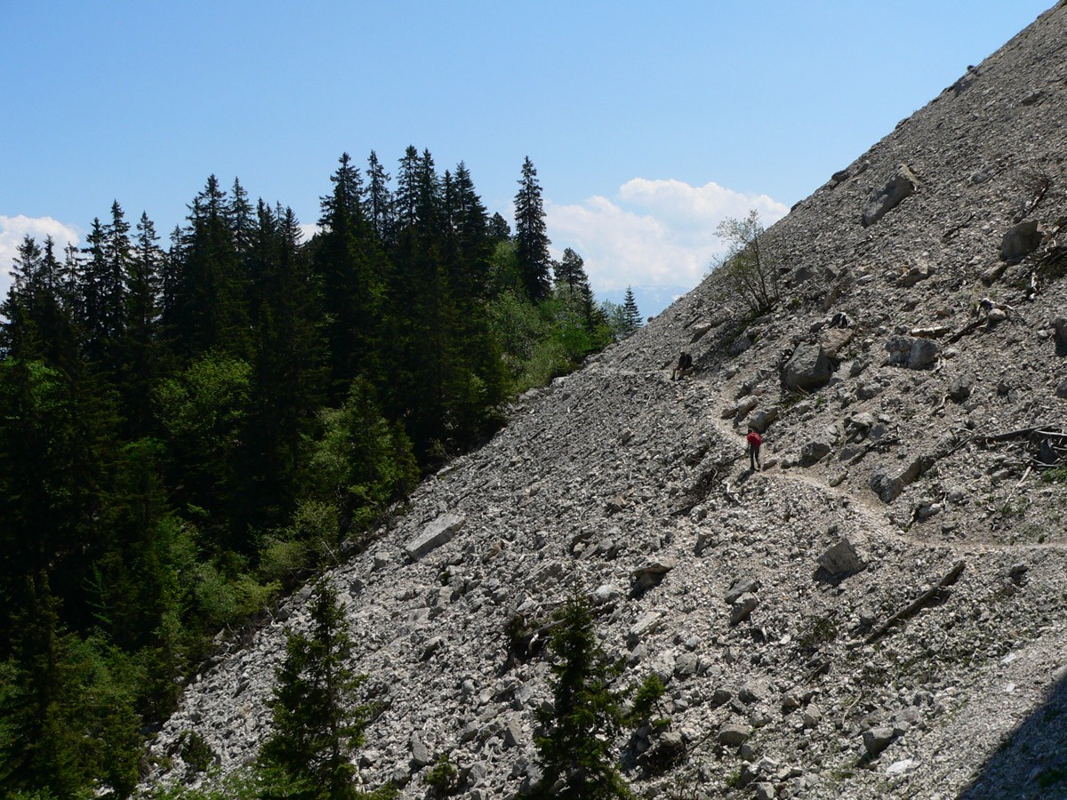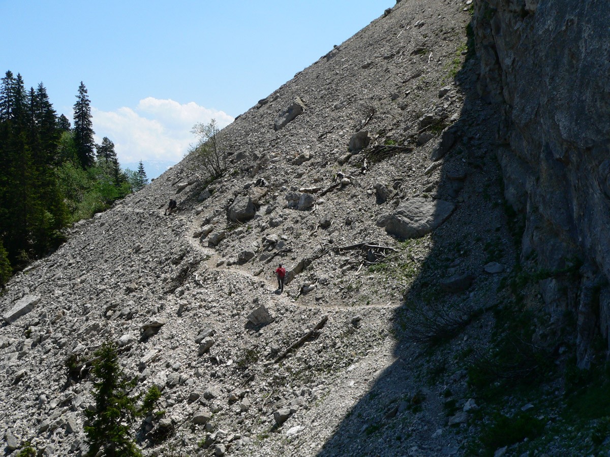 La descente par le Vallon des Forges passe par endroit entre des blocs, sans difficultés notoires si les névés sont tous fondus.
