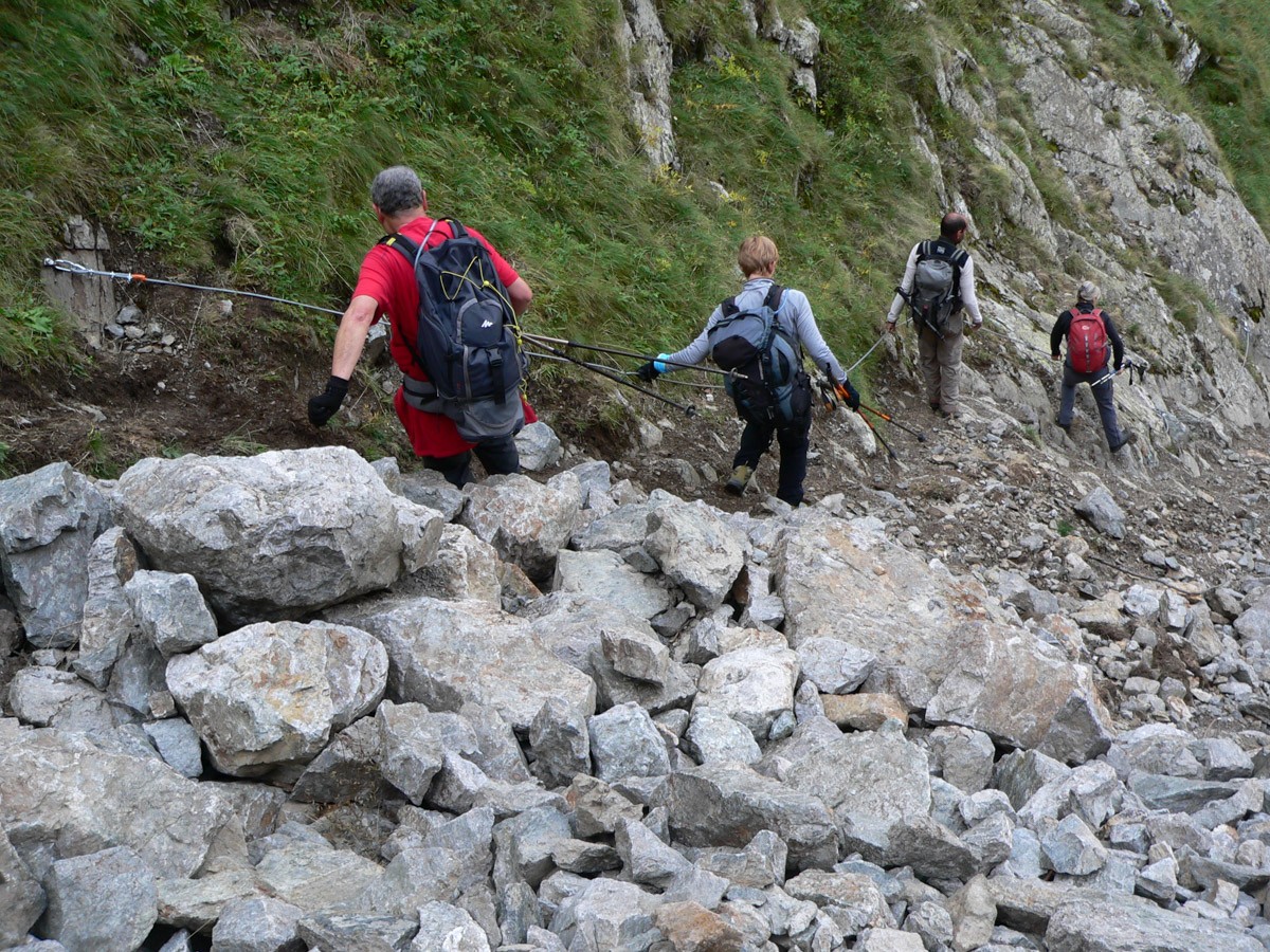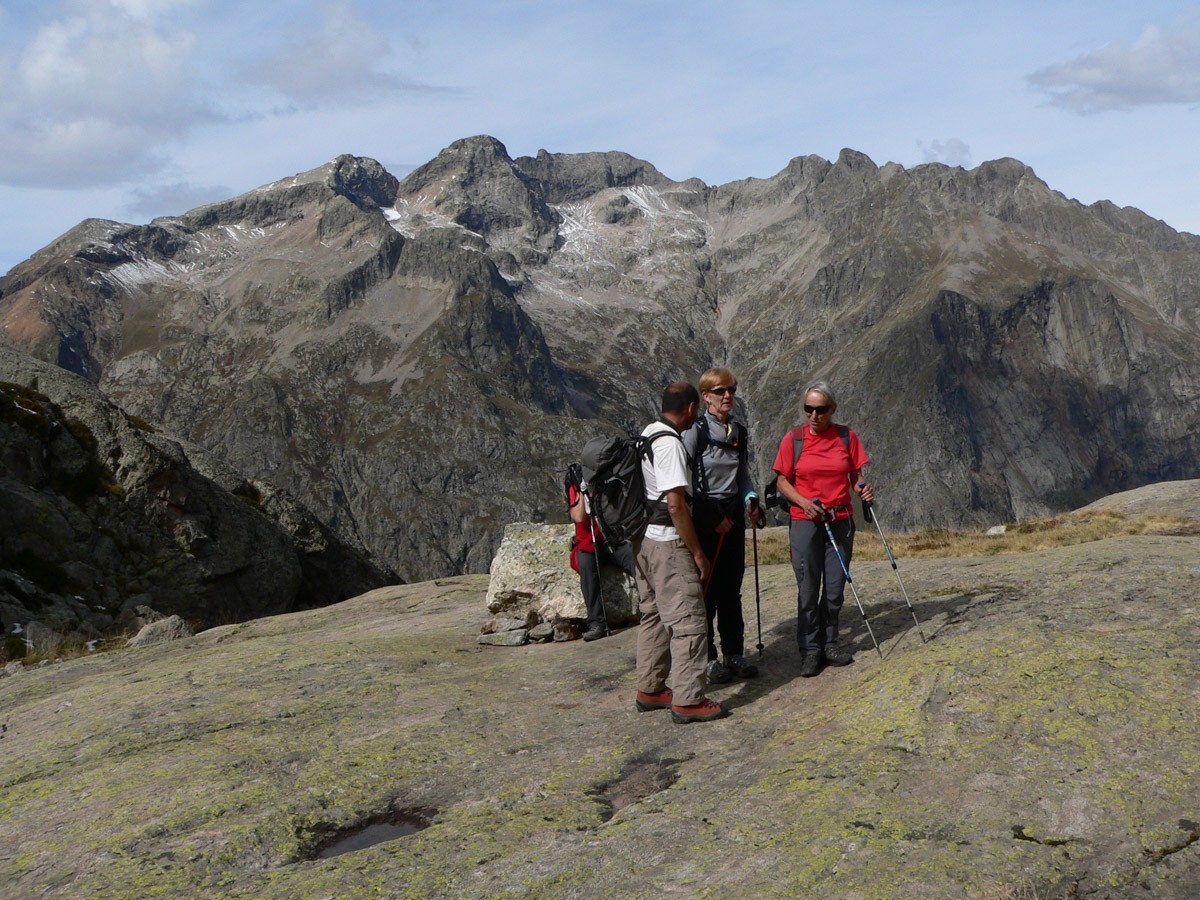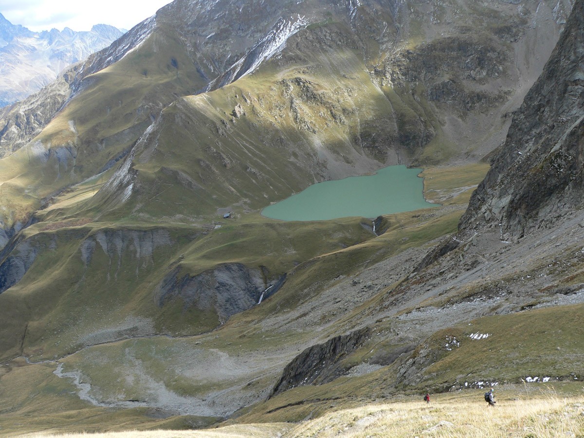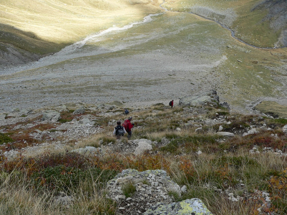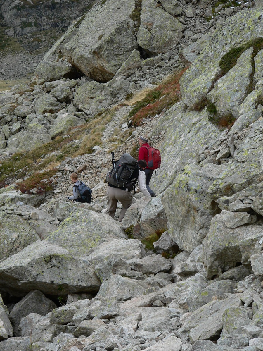 Difficulté : D'abord le dénivelé important et la longueur. De plus, la neige vient de faire son apparition en altitude. Nous verrons donc sur place l'état du terrain. Après le lac du Lauvitel, entre la Côte de la Traversette et le ruisseau de l'Embernard, le GR 54 a été emporté en 2014 par des éboulements. Il a été entièrement restauré sur cette partie (purge, retraçage, déroctage et pauses de mains courantes), réouverture fin juin 2015. Néanmoins toute cette partie, située dans une zone de pente importante (passage du ravin, dalle et béquet rocheux), demande une grande vigilance, surtout en terrain humide. De même, le début de la descente du col du Vallon sur le lac de la Muzelle, très pentu, réclame de l'attention.