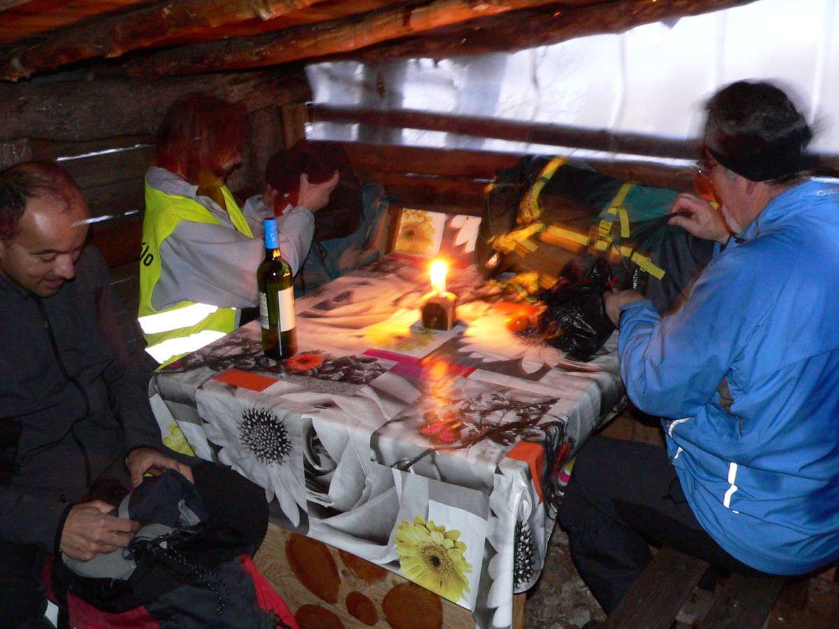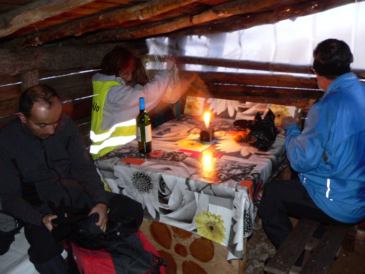 Matériel : Frontale (avec piles en état) sur le haut du sac, indispensable pour le repas et la descente (!),guêtres, bâtons, chaînes à neige (utilité ?), de quoi se couvrir (vêtements d'hiver : polaire, gants, bonnet…), vêtement coupe-vent, + … tout le reste.